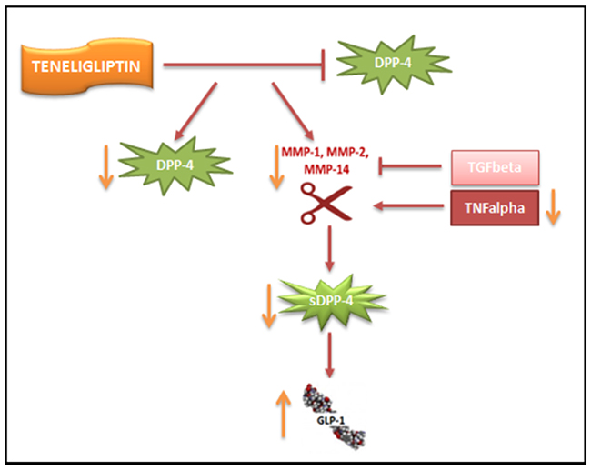Figure 5: Proposed scheme for the downregulation of DPP-4 by Teneligliptin. Teneligliptin downregulates DPP-4 on two different levels: (i) it reduces DPP-4 mRNA and protein levels under HG conditions; and (ii) it indirectly inhibits the shedding of DPP-4 by downregulating MMP1, MMP2 and MMP14 gene expression via TNFα.