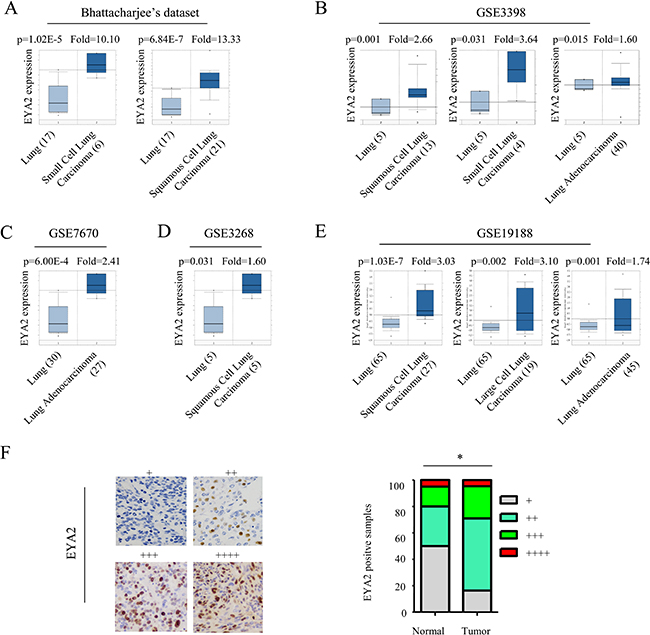 Figure 1: EYA2 is overexpressed in lung cancer. (A–E) Expression levels of EYA2 mRNA in five lung cancer datasets: Bhattacharjee’s dataset (A), GSE3398 (B), GSE7670 (C), GSE3268 (D) and GSE19188 (E). (F) EYA2 expression in 86 lung cancer tissues and 20 non-tumor lung tissues examined by immunohistochemisty. Expression levels of EYA2 were scored semi-quantitatively based on the percentage of positive cells according to the following scale: +, <25%; ++, 25–49%; +++, 50–74%; and ++++, 75–100% (G). Scale bars = 50 μm.