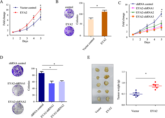 Figure 2: EYA2 promotes lung cancer cell proliferation in vitro and in vivo. (A, B) cell growth assay (A) and colony formation assay (B) of A549 cells with stable EYA2 expression. (C, D) cell growth assay (C) and colony formation assay (D) of A549 cells stably transfected with EYA2 shRNAs (EYA2-shRNA1, EYA2-shRNA2 and EYA2-shRNA3). All experiments were performed at least three times; bars, s.e.m.; *p < 0.05. (E) in vivo xenograft model of lung tumor. A549 cells with stable expression of EYA2 or vector control were subcutaneously injected into two groups of nude mice. Representative images showing ablation of subcutaneous xenograft tumors and the weight of the tumors. Bars, s.e.m.; *p < 0.05.