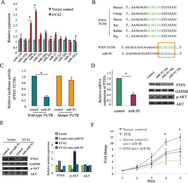 Figure 5: EYA2 suppresses PTEN expression via modulation of miR-93. (A) The expression of PTEN-targeting miRNAs affected by EYA2 in A549 cells. (B) The predicted miR-93 binding sites in the 3′UTR of PTEN were conserved in different various species. (C) A549 cells were transfected with 3′UTR of wild-type and mutated human PTEN promoter reporter (Wild-type 3′UTR or Mutant 3′UTR) in the presence of exogenous miR-93, and luciferase activities were measured using the Dual Luciferase Reporter Assay System (Promega, Madison, WI, USA). (D) Forced expression of miR-93 reduced PTEN expression at both the mRNA and protein levels in A549 cells. (E) The endogenous miR-93 was suppressed by transfection of A549 cells with anti-miR-93 oligonucleotides, then the suppression effect of EYA2 on PTEN expression was examined by immunoblot assay. The densitometry was quantified with a FluorChem FC2 imaging system (Alpha Innotech, San Leandro, CA, USA). Protein levels were normalized to GAPDH and quantified with respect to vector control group. (F) A549 cells with stably-expressing EYA2 were transfected with anti-miR-93 oligonucleotides and cell growth was examined by CCK-8 assay. All the experiments were performed in triplicate. Bars, s.e.m.; *p < 0.05.