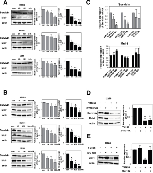 Figure 2: YM155 suppresses the expression of survivin and Mcl-1 protein. (A) The cells (KMS12, KMS11, and U266) were treated with 0.1 μM YM155 for indicated time periods (control: 0.1% DMSO). (B) The cells were treated with 10, 100, or 300 nM YM155 for 24 hr. Expression levels of survivin and Mcl-1 protein were analyzed by immunoblotting (left panel) as described in Materials and Methods. Histograms (right panels) represent the ratio of band intensity of drug-treated to vehicle-treated, each normalized to background. Error bars represent SD from triplicate experiments. (C) Expression levels of survivin and Mcl-1 mRNA were analyzed by real-time RT-PCR analysis using 18s rRNA as an internal control. The cells (KMS12, KMS11, and U266) were treated with 1 μM YM155 for indicated time periods (control: 0.1% DMSO). After drug treatment, total RNA was prepared. Colums, mean from three separate experiments. *P<0.05, **P<0.01. (D) The U266 cells were incubated with 0.1 μM YM155 in the presence or absence of 30 μM Z-VAD-FMK for 24 hr. Z-VAD-FMK was added 60 min before addition of YM155. Survivin and Mcl-1 protein expression was analyzed by immunoblotting (left panel). Histograms (right panels) represent the ratio of band intensity of drug-treated to vehicle-treated, each normalized to background. Error bars represent SD from triplicate experiments. (E) The U266 cells were incubated with 0.1 μM YM155 or 20μM MG-132, alone or in combinations for 6 hours. MG-132 was added 60 min before addition of YM155. Mcl-1 protein expression was analyzed by immunoblotting (left panel). Histograms (right panels) represent the ratio of band intensity of drug-treated to vehicle-treated, each normalized to background. Error bars represent SD from triplicate experiments. **P<0.01.