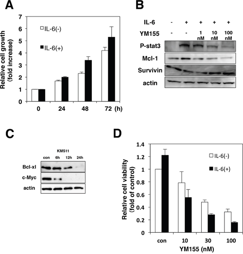Figure 4: YM155 inhibits IL-6/STAT-3 signaling pathway. (A) KMS12 cells were incubated with or without IL-6 (100 ng/ml) for indicated time periods. The cell growth was determined by trypan blue dye exclusion assay. All quantitative data are shown as the mean of three independent experiments. Error bars represent SD from triplicate experiments. (B) KMS12 cells were incubated with IL-6 (100 ng/ml) for 9 h in the presence or absence of YM155. YM155 was added 60 min after addition of IL-6. The phosphorylation of STAT3 and the expression of Mcl-1 and survivin protein were analyzed by immunoblotting analysis as described in Materials and Methods. (C) The expression levels of Bcl-xl and c-Myc protein were analyzed by immunoblotting. KMS11 cells were treated with 0.1 μM YM155 for indicated time periods (control: 0.1% DMSO). (D) KMS12 cells were incubated with YM155 at indicated concentrations in the absence or presence of IL-6 (100 ng/ml) for 48 hr. YM155 was added 60 min after addition of IL-6. The cell viability was determined by trypan blue dye exclusion assay. All quantitative data are shown as the mean of three independent experiments. Error bars represent SD from triplicate experiments.