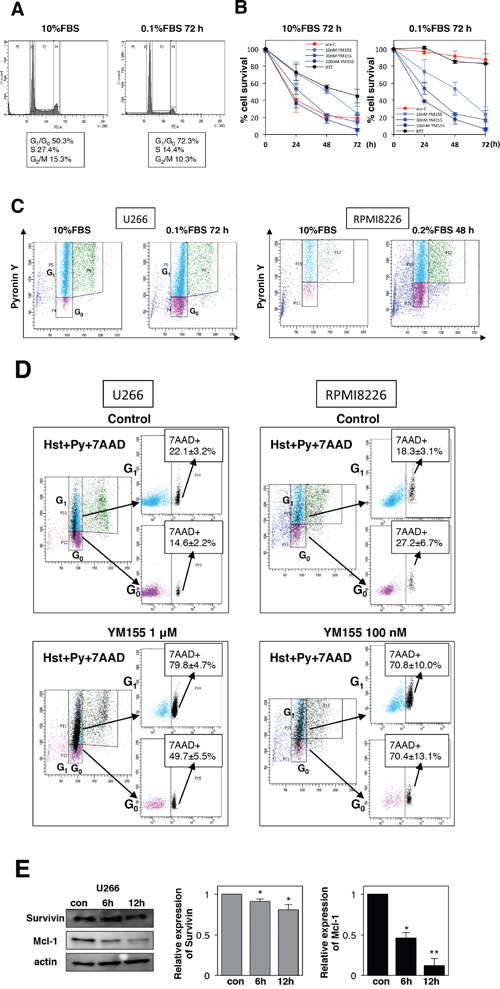 Figure 5: YM155 potently induces cell death in quiescent (G0/G1) MM cells. (A) U266 cells were incubated in 0.1% or 10% FBS medium for 72 h, and cell-cycle profiles were examined by flow cytometry. (B) U266 cells were cultured in 0.1% or 10% FBS medium for 72 h, then the cells were incubated with various concentrations of YM155, 0.1 mM ara-C or 3 nM bortezomib at 37°c for indicated time periods. Cell survival inhibition rate was determined by trypan blue dye exclusion assay. (C) U266 cells were cultured in 0.1% or 10% FBS medium for 72h. RPMI8226 cells were cultured in 0.2% or 10% FBS medium for 48h. Flow cytometry was done to investigate G0 populations by double staining DNA with Hoechst33342 (Hst) and RNA with pyronin Y (PY). The G0 population (2N DNA/low levels of RNA, Hst+/PY-) was discriminated from the G1 population (2N DNA/high levels of RNA, Hst+/PY+). Results are representative of 3 separate sets of experiments. (D) G0-riched U266 or RPMI8226 cells were cultured in presence or absence (control: 0.1% DMSO) of YM155 (1 μM or 100 nM) for 24 hr. Triple color flow cytometeric analysis was performed to assess cell death (7-AAD positive cells) in G0 and G1 populations compared with control. Results (7-AAD positive cells) are representative of 3 separate sets of experiments. (E) U266 cells were cultured in low-serum-containing medium for 72 h, then the cells were incubated with 0.1 μM YM155 at 37°c for indicated time periods. The expression of survivin and Mcl-1 protein was analyzed by immunoblotting analysis. Histograms (right panels) represent the ratio of band intensity of drug-treated to vehicle-treated, each normalized to background.