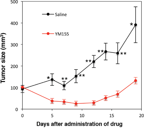 NOD-SCID mice were purchased from Charles River Laboratories Japan, Inc. (Yokohama, Japan). Animal experiment protocol was approved by the institutional review board of International University of Health and Welfare, Tochigi, Japan. Cell suspensions in 100 μl of RPMI 1640 medium together with 100 μl of Matrigel basement membrane matrix (BD Biosciences) were inoculated subcutaneously into the flank of eight-week-old female NOD/SCID mice. Twenty days later, mice were randomly divided into two groups (n = 6/group). YM155 was administered intraperitoneally once daily at 5mg/kg for 9 days. Caliper measurements of the longest perpendicular tumor diameters were performed every alternate day to estimate tumor volume using the following formula: 4/3π × (width/2)2 × (length/2), which represents the three-dimensional volume of an ellipse.