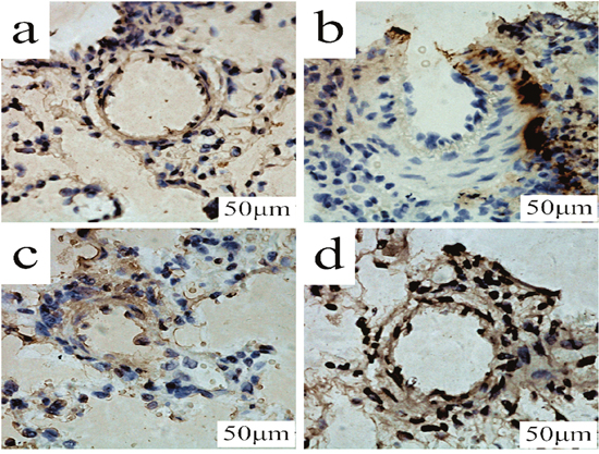 Figure 8: TUNEL determination of PCPA on apoptosis in lung tissues. Lung tissues obtained from (a) control group, (b) monocrotaline (MCT) group, (c) MCT plus 50 mg/kg body mass 4-Chloro-DL-phenylalanine (PCPA) group (P1), and (d) MCT plus 100 mg/kg body mass PCPA group (P2). (Original magnification × 400, scale bars = 50 μm).