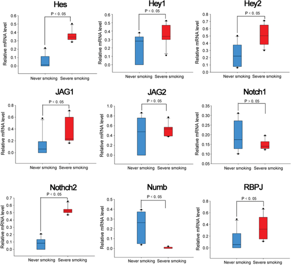 Figure 4: mRNA expression level of Notch pathway genes in bronchial mucosa of heavy smokers and never-smokers. (A) qPCR analysis was perforemed to assess mRNA expression of NOTCH signlaing pathway members, including NOTCH1, JAG1, Hey1, Hey2, Numb, JAG2, NOTCH2, Hes, DNM1, RBPJ, in lung samples collected from heavy-smokers and non-smokers. GAPDH was used as an endogenous control.