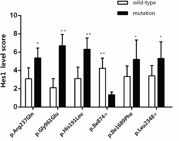 Figure 8: The effect of six SNPs on Hes1 expression level in cancer tissue of NSCLC by immunohistochemistry. Immunnohistochemistry for Hes1 was performed on NSCLC samples from patients with specific SNPs and expression levels scored from 1-10. *P<0.05, **P<0.01 wild-type vs mutation.