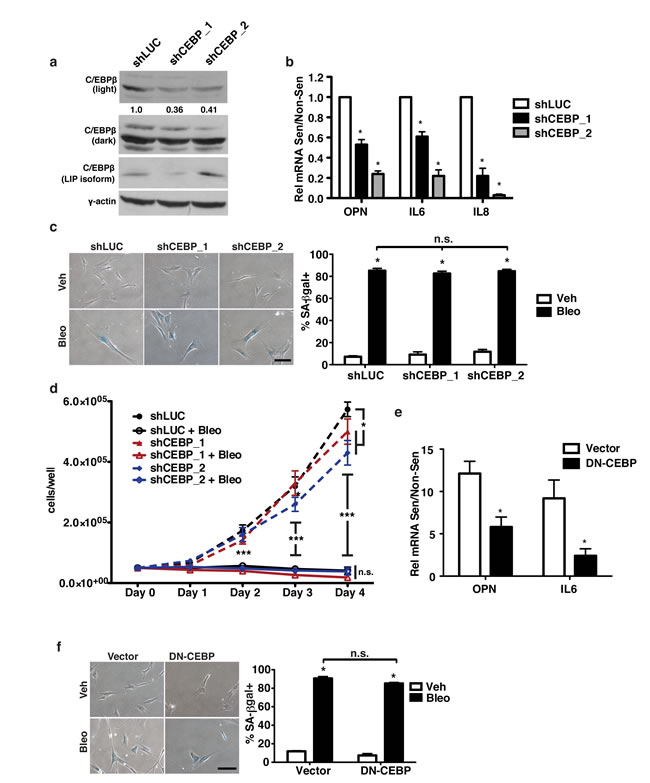 Figure 2: C/EBPβ is required for OPN induction in response to senescence. a. C/EBPβ protein was measured in control or shCEBP-expressing cells via Western blot. shCEBP_1 had 64% reduced levels of activating C/EBPβ isoforms (LAP1&2) while shCEBP_2 had 59% reduced activating C/EBPβ isoforms, n=3. b. OPN, IL-6, and IL-8 mRNA expression were decreased in senescent shCEBP_1 and shCEBP_2 BJs relative to control (shLUC), n=3, *p<0.05. c. Senescence-associated β-galactosidase (SA-βgal) staining was used to measure senescence induction in BJ fibroblasts expressing one of two independent shRNAs targeting C/EBPβ (shCEBP_1, shCEBP_2) or a control hairpin (shLUC) and treated with bleomycin (Bleo, left). There is no significant difference in percent SA-βgal+ cells among any of the hairpins (right), n=3, n.s.=non-significant, *p<0.05. Scale bar=100 μm d. Cell proliferation over four days in non-senescent or bleomycin-treated fibroblasts was not affected by depletion of C/EBPβ, n=3, *p<0.05. e. Expression of OPN and IL-6 are significantly reduced in senescent cells expressing dominant negative C/EBPβ (DN-CEBP) relative to empty vector control, n=4, *p<0.05 f. SA-βgal staining indicates no change in senescence induction following bleomycin treatment in vector compared to DN-CEBP fibroblasts, n=3, n.s.=non-significant, *p<0.05, ***p<0.001. Scale bar=100 μm.