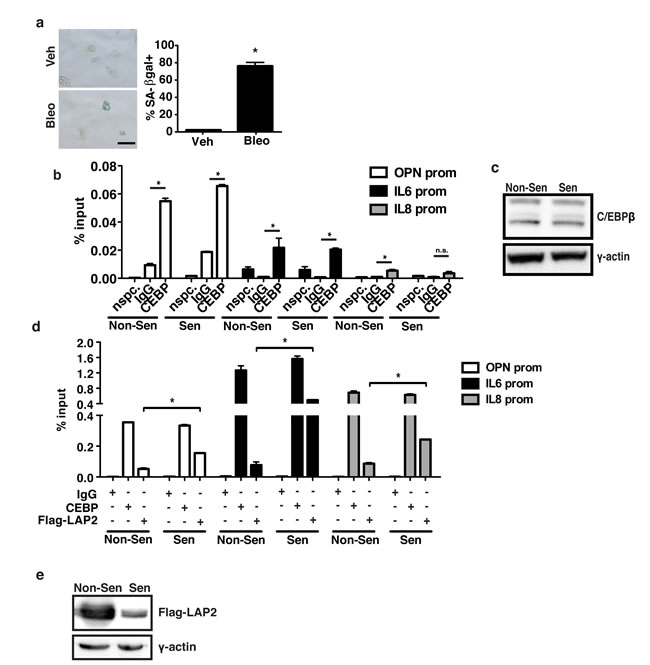 Figure 3: C/EBPβ isoform binds SASP promoters in senescent cells. a. Treatment of 293T HEK cells with bleomycin induces a significant increase in senescence as indicated by increased senescence-associated β-galactosidase staining, n=3, *p<0.05. Scale bar=100 μm. b. Chromatin immunoprecipitation (ChIP) using a C/EBPβ antibody which recognizes all three C/EBPβ isoforms or a non-specific control (IgG) indicates that C/EBPβ significantly binds to the OPN and IL-6 promoters in both vehicle and bleomycin-treated 293Ts, and to the IL-8 promoter in vehicle treated cells, representative experiment, n=3, *p<0.05. “nspc.” indicates pulldown with C/EBPβ antibody at a distal site. c. Western blot using an anti-CEBPβ antibody indicating similar C/EBPβ expression in non-senescent and senescent ChIP treatments, n=1. d. ChIP in 293Ts transfected with a Flag-tagged activating C/EBPβ isoform (Flag-LAP2). An antibody recognizing all three C/EBPβ isoforms (CEBP) or an anti-Flag antibody was used to detect binding of the total C/EBPβ relative to exogenous Flag-LAP2 to the OPN, IL-6 and IL-8 promoters in vehicle (Non-Sen) and bleomycin-treated (Sen) 293Ts. While there was little change in total C/EBPβ bound to the OPN, IL-6, or IL-8 promoters, Flag-LAP2 binding to all three promoters was significantly increased in senescent cells, representative experiment, n=3, *p<0.05. e. Western blotting using an anti-Flag antibody indicated that Flag-LAP2 expression is significantly higher in non-senescent 293Ts than senescent 293Ts, n=3.