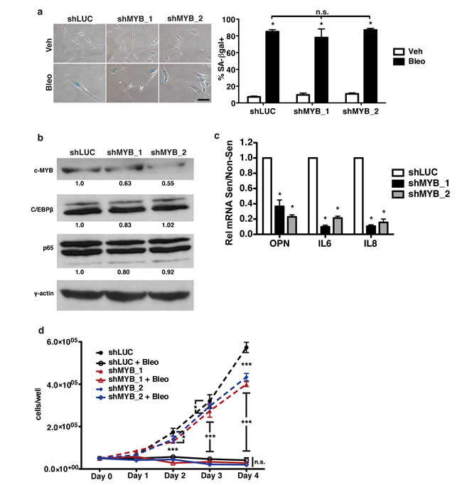 To establish a role for c-Myb in the regulation of OPN during senescence, human fibroblasts were depleted of c-Myb using two independent short hairpins. Using bleomycin to induce senescence (Figure 4a), we measured OPN mRNA expression by qRT-PCR. Using two hairpins to deplete c-Myb, we observed a 37% and 45% (shMYB_1 and shMYB_2, respectively) reduction in c-Myb protein levels relative to γ-actin (Figure 4b), which resulted in a 64% and 77% decrease in OPN mRNA induction relative to shLUC control (Figure 4c). Importantly, depletion of c-Myb did not inhibit senescence-induction, as measured by SA-βgal and cell growth assays, indicating that c-Myb is necessary for OPN induction but not senescence induction (Figure 4a, 4d). In addition, depletion of c-Myb had little or no effect on C/EBPβ or NF-κB (p65) protein levels (Figure 4b), further indicating that c-Myb acts to transcriptionally regulate the SASP, not via indirect regulation of these transcription factors.