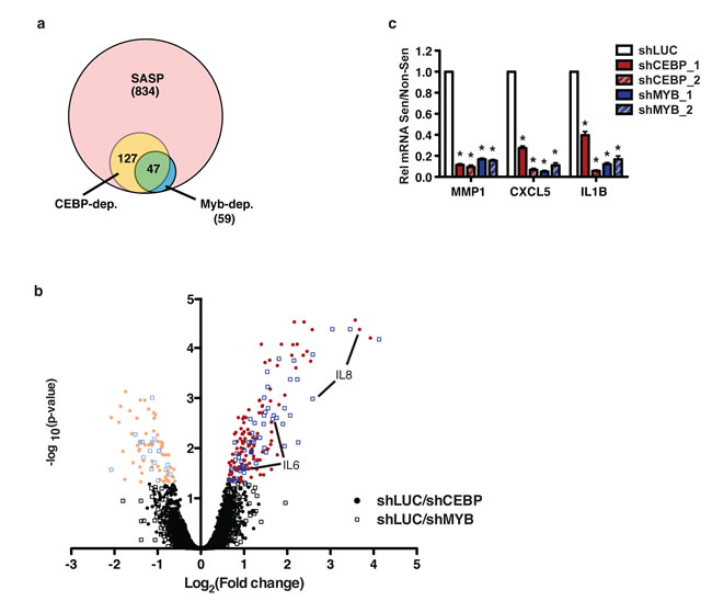 Figure 6: c-Myb and C/EBPβ regulate a subset of the SASP. a. A microarray was performed to compare gene expression and induction in response to senescence among control, shCEBP_2 and shMYB_1 expressing fibroblasts. 834 genes were identified as SASP factors. Of these, 127 were solely C/EBPβ dependent, 12 were solely c-Myb dependent, and 47 were dependent on both transcription factors. Genes were considered dependent if their induction in response to senescence was significantly reduced in the experimental hairpin condition relative to control, p<0.05. b. The log2 fold change in induction (bleomycin over non-senescent) of shLUC relative to shCEBP_2 or shMYB_1 is plotted relative to the negative log10 of the p-value. Genes with significantly higher (bright colors, right) or lower (pale colors, left) induction in shLUC relative to shCEBP (circles) or shMYB (open boxes) are indicated. c. The C/EBPβ- and c-Myb-dependent SASP factors MMP1, CXLC5, and IL1B were validated using qRT-PCR. Depletion of C/EBPβ or c-Myb with two different hairpins each significantly reduced induction of these SASP factors.