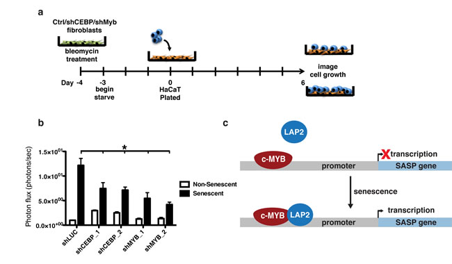 Figure 7: Depletion of c-Myb or C/EBPβ inhibits preneoplastic cell growth promotion by senescent fibroblasts. a. HaCAT keratinocytes expressing CBR luciferase were cocultured with non-senescent or senescent BJs expressing either a control shRNA (shLUC) or shRNAs targeting C/EBPβ (shCEBP_1 and shCEBP_2) or c-Myb (shMYB_1 and shMYB_2). HaCAT proliferation was measured using bioluminescent imaging after six days of coculture, shown as fold growth when cocultured with senescent fibroblasts relative to non-senescent fibroblasts. b. Depletion of either C/EBPβ or c-Myb in senescent BJ fibroblasts significantly reduces the ability to promote HaCAT cell growth, n=3, *p<0.05. c. Schematic showing the proposed model of regulation of OPN and other SASP factors by c-Myb and C/EBPβ. In response to senescence, the activating isoform of C/EBPβ, LAP2, increases occupancy on the SASP promoter, inducing transcription.