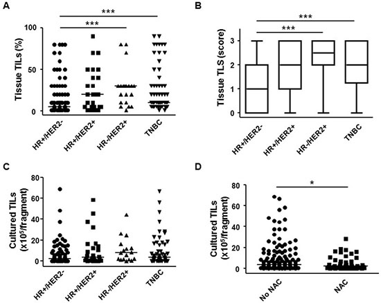 Sources of TILs in ex vivo cultures are the cells within tumors and in the tertiary lymphoid structures (TLSs) in the tumor-adjacent tissue. Therefore, we first estimated the levels of TILs and TLSs in each subtype of breast cancer by analyzing hematoxylin and eosin (H&E)-stained sections of cancer tissues from 198 patients (Supplementary Table 1). The percentage of TILs and the degree of TLSs within HR+/HER2− tissue were significantly lower than those in HR−/HER2+ or HR−/HER2− triple-negative breast cancer (TNBC) subtypes (Figure 1A and 1B). However, the distributions of the percentage of TILs (median, 5%; range, 1–80% in HR+/HER2−; median, 20%; range, 1–90% in HR+/HER2+; median, 30%; range, 1–80% in HR−/HER2+; median, 10%; range, 1–90% in TNBC) and the degree of TLS (median score 1 in HR+/HER2−; median 2 in HR+/HER2+; median 2.5 in HR−/HER2+; median 2 in TNBC; and score range 0–3 for all subtypes) within each subtype were quite broad (Figure 1A and 1B), indicating that the subtype itself cannot provide a good indication of the levels of TILs or TLS.