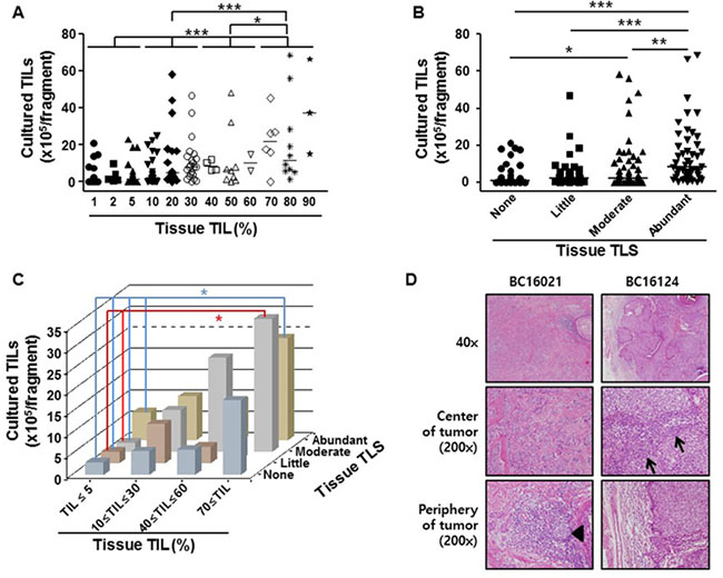 Figure 2: Correlation between the number of 2 week TILs and TIL percentage or TLS degree in breast cancer tissues. (A) The number of TILs per fragment (y-axis) obtained after 2 weeks’ ex vivo culture from breast cancer tissues was plotted against histologically determined tissue TIL percentage (x-axis): Tissue TILs: 1% (n = 29), 2% (n = 5), 5% (n = 45), 10% (n = 26), 20% (n = 19), 30% (n = 22), 40% (n = 4), 50% (n = 9), 60% (n = 2), 70% (n = 6), 80% (n = 10), and 90% (n = 3). Tumor samples were grouped as follows for statistical analysis: TILs ≤5%, 10%≤ TIL ≤30%, 40%≤ TIL ≤60%, or 70% ≤ TIL. (B) The number of TILs per fragment (y-axis) obtained after the 2 week culture was plotted against tissue TLS degree (x-axis) grouped as follows: Tissue TLS degree, none (n = 42), little (n = 35), moderate (n = 56), and abundant (n = 47). (C) The average number of TILs per fragment (z-axis) obtained after the 2 week culture was plotted in the space defined by both percentage of tissue TILs (x-axis) and TLS degree (y-axis) in the same sample: 1%≤ tissue TILs ≤5% and TLS none (n = 36); 1%≤ tissue TILs ≤5% and TLS little (n = 19); 1%≤ tissue TILs ≤5% and TLS moderate (n = 19); 1%≤ tissue TILs ≤5% and TLS abundant (n = 5); 10%≤ tissue TILs ≤30% and TLS none (n = 4); 10%≤ tissue TILs ≤30% and TLS little (n = 14); 10%≤ tissue TILs ≤30% and TLS moderate (n = 32); 10%≤ tissue TILs ≤30% and TLS abundant (n = 17); 40%≤ tissue TILs ≤60% and TLS none (n = 1); 40%≤ tissue TILs ≤60% and TLS little (n = 2); 40%≤ tissue TILs ≤60% and TLS moderate (n = 3); 40%≤ tissue TILs ≤60% and TLS abundant (n = 9); 70%≤ tissue TILs and TLS none (n = 1); 70%≤ tissue TILs and TLS little (n = 0); 70%≤ tissue TILs and TLS moderate (n = 2); and 70%≤ tissue TILs and TLS abundant (n = 16). Kruskal–Wallis test and Mann–Whitney U-test were used for statistical analysis. *p < 0.05, **p < 0.01, ***p < 0.001. (D) Representative examples of H&E sections showing low numbers of TILs (5%) and little TLS (left panels: sample BC16021, 18.7 × 105 TILs/fragment obtained after 2 weeks’ culture), and high numbers of TILs (70%) and no TLS (right panels: sample BC16124, 17.7 × 105 TILs/fragment obtained after culture). Arrows indicate TILs, and the arrowhead indicates TLS.