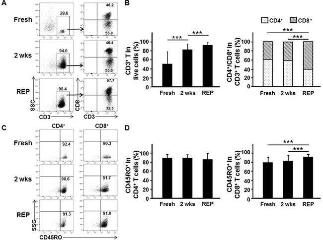 Figure 3: Ex vivo TIL culture enriches memory phenotype CD8+ T cells. Analysis of T cells and their subsets (A, B), and memory phenotype T cells (C, D) in TILs. Single cells directly derived from fresh breast cancer tissues (fresh, n = 33), TILs obtained after 2 weeks’ ex vivo culture of breast cancer tissue fragments (2 wks, n = 132), and post-REP TILs (REP, n = 45) were analyzed by flow cytometry. (A) Representative FACS data showing percentage of T cells (CD3+) among live cells, percentage of CD4+ T cells (CD3+CD8−) and of CD8+ (CD3+CD8+) T cells among T cells, and (C) percentages of memory phenotype CD4+ T cells (CD3+CD8−CD45RO+) and CD8+ T cells (CD3+CD8+CD45RO+) among CD4+ T cells (CD3+CD8−) and CD8+ T cells (CD3+CD8+), respectively. (B, D) FACS results expressed as the mean ± SD summarized as histograms. Kruskal–Wallis test and Mann–Whitney U-test were employed for statistical analysis. ***p < 0.001.