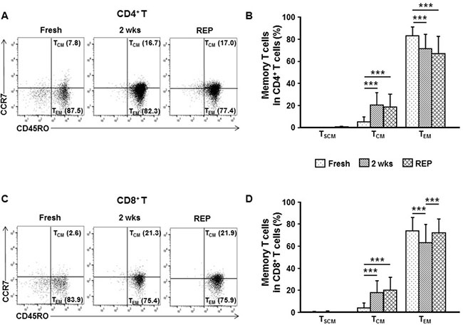Figure 4: Ex vivo TIL culture does not compromise the proportion of the central memory phenotype T cell subset. Memory CD4+ (A, B) and CD8+ (C, D) T cell subpopulations among single cells directly derived from fresh breast cancer tissue (fresh, n = 33), those among TILs obtained after the 2 week ex vivo culture of breast cancer tissue fragments (2 wks, n = 132), and those among post-REP TILs (REP, n = 45) were analyzed by flow cytometry. Representative FACS data showing percentage of memory stem T cells (TSCM, CD45RO−CCR7+CD62L+CD95+), central memory phenotype T cells (TCM, CD45RO+CCR7+), or effector memory T cells (TEM, CD45RO+CCR7−) among CD4+ (A) and CD8+ (C) T cells. (B, D) FACS results expressed as the mean ± SD summarized as histograms. Kruskal–Wallis test and Mann–Whitney U-test were employed for the statistical analysis. ***p < 0.001.