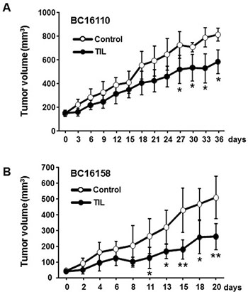Figure 6: In vitro tumor-reactive post-REP TILs are functional in a PDX mouse model in vivo. PDX mice were created by implanting tumor tissues derived from each of two patient samples (from a lymph node with metastatic breast cancer, sample BC16110 (A), and from breast, sample BC16158 (B)). When tumors in the PDX mice were palpable, 1 × 107 post-REP TILs (TIL group, n = 4 for BC16110 and n = 5 for BC16158) or PBS (control group, n = 4 for BC16110 and n = 5 for BC16158) was administered into the tail vein, and IL-2 (200,000 IU/mice) and IL-15 (1 μg/mice) were administered simultaneously into the peritoneal cavity of the mice in both groups. Then, IL-2 (200,000 IU/mice) was administered for the following 2 days (total of three times) and IL-15 (1 μg/mice) was administered every other day for 8 days (total of five times). After administration of TILs (day 0), tumor size was measured using calipers. Tumor volumes were calculated using the formula ½ × length × (width)2 and expressed as the mean ± SD. A non-paired Student’s t-test was performed. *p < 0.05, **p < 0.01.