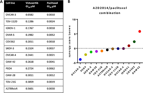 Figure 1: Growth inhibition by vistusertib and paclitaxel in a human ovarian cancer cell line panel. (A) GI50 of vistusertib and paclitaxel in ovarian cancer cell lines. (B) Synergy score using Loewe model of additivity. Only one cell line showed a synergy score of > 5.
