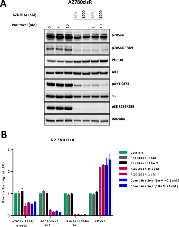 We chose to study A2780cis as it represented the cisplatin resistance seen in advanced ovarian cancer and was representative of the median of the synergy index in the panel of ovarian cancer cell lines studied. We quantified p-S6K (S235/236) and p-AKT (S473) levels in cells exposed to paclitaxel and vistusertib for 24 h. There was robust inhibition of signaling to targets of mTORC1 (S6K, S6) and mTORC2 (AKT) in A2780Cis treated with vistusertib or the combination of paclitaxel and vistusertib. In addition, we observed induction of the tumor suppressor protein PDCD4 (programed cell death protein 4), which is negatively regulated by S6K, confirming robust inhibition of S6K activity in this model (Figure 2).