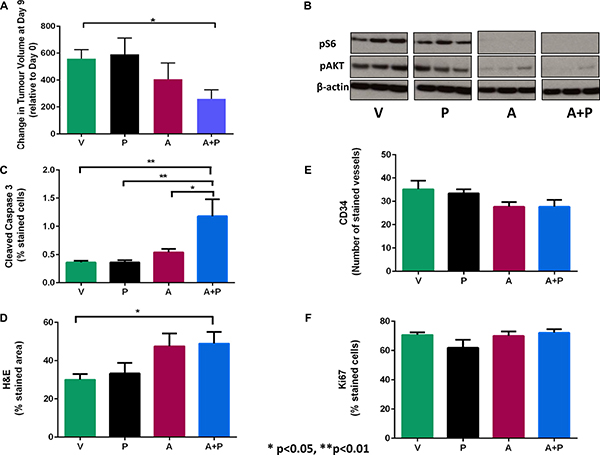 Figure 3: Growth and molecular response of A2780CisR xenografts following 2 weeks of treatment with vistusertib. (A) alone, paclitaxel (P) alone, the combination of vistusertib and paclitaxel (A+P) and vehicle (V). (A) Changes in tumor volume after 2 weeks of treatment. (B) western blots of pSer473-AKT and p-Ser240/244-S6 protein and β-actin (loading control). (C)Immunohistochemistry was used to stain cleaved Caspase-3 for apoptosis. (D) H&E for necrosis (E), CD34 for microvessel density. (F) Ki67 for proliferation . Data are expressed as median and interquartile ranges (25% and 75%). *p < 0.05 and ***p < 0.001; n = 9 in each treatment group.