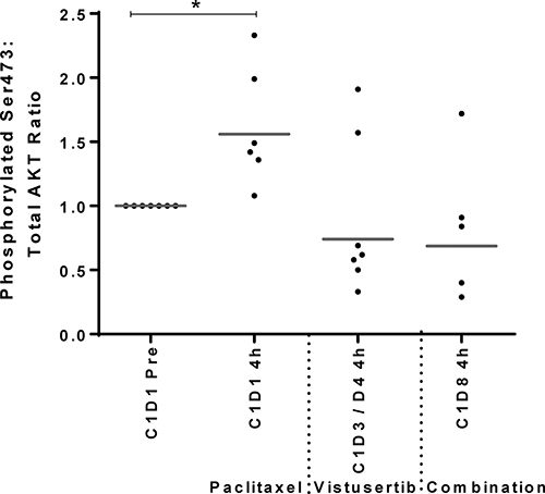 Patients with ovarian cancer who received paclitaxel and vistusertib on a phase I study had platelet-rich plasma (PRP) collected at 4 h following dosing with either agent alone or in combination. Interestingly, there was a statistically significant increase in p-AKT (S473) levels following administration of paclitaxel (p = 0.0225) and reduction of p-AKT levels in 5 out of 7 patients following dosing with vistusertib (p = 0.634). The addition of vistusertib to paclitaxel reduced the p-AKT levels that were induced following paclitaxel dosing in 4 out of 5 patients (p = 0.0996; Figure 5).