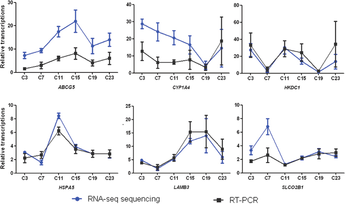 To verify the results from RNA-sequencing, 6 differentially expressed transcriptions namely ATP-binding cassette transporters G5 (ABCG5), cytochrome P450 1A4 enzyme (CYP1A4), Hexokinase Domain Containing 1 (HKDC1), heat shock 70 kDa protein 5 (HSPA5), β3 polypeptide chain of laminin 5 (LAMB3), and organic anion transporting polypeptide 2B1 (SLCO2B1) were randomly selected for RT-PCR analysis. Our results showed that the detection of relative up- and down-regulation of these mRNA levels by RT-PCR was in agreement with the transcriptomics results (Figure 3).
