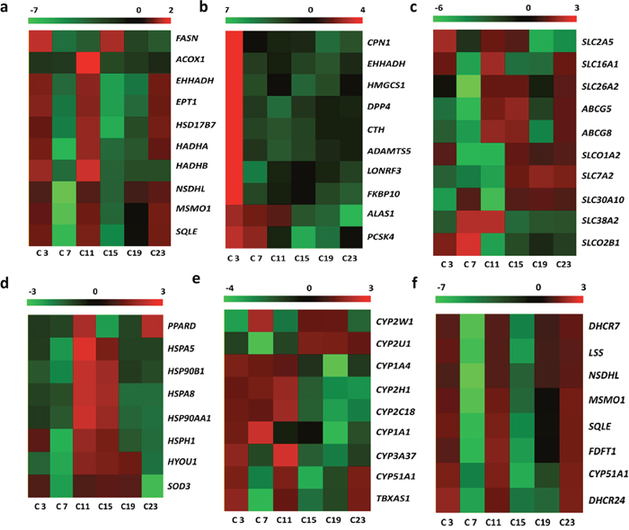 Figure 3: Diurnally regulated transcripts of liver targeted for nutrient metabolism. (a) Lipid biosynthesis and metabolism; (b) protein catabolism and amino acid generation; (c) transporters; (d) oxidation-reduction metabolism; (e) anti-stress response; (f) steroid biosynthesis. C3, C7, C11, C15, C19, and C23 refer to samples collected at 03:30, 07:30, 11:30, 15:30, 19:30, and 23:30.