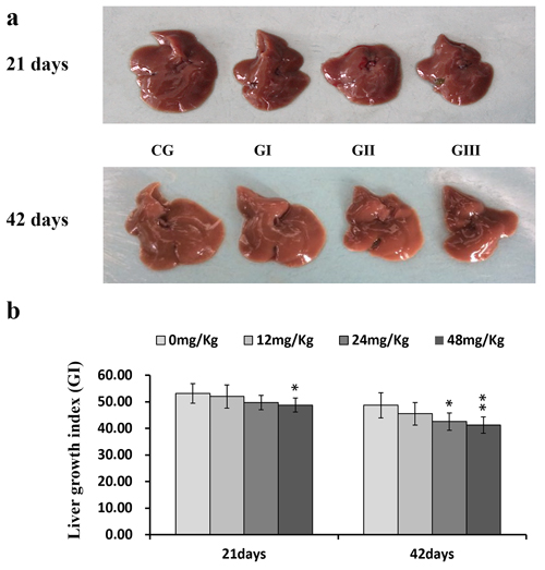 Liver development was evaluated based on liver growth index (GI) values. GI values were similar in the control and 12 mg/kg groups throughout the 42-day experiment and in the control and 24 mg/kg groups on day 21 of the experiment. However, GI was lower (P < 0.05 and P < 0.01) in the 48 mg/kg group on days 21 and 42 and in the 24 mg/kg group on day 42 than in the control group (Figure 1b).