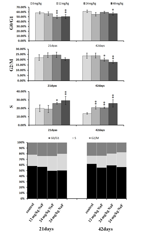Percentages of cells in the G0/G1 phase decreased (p < 0.05 or p < 0.01) in the 48 mg/kg group at both days 21 and 42 and in the 24 mg/kg group at day 21 of the experiment when compared to the control group. Percentages of cells in the G2/M phase were also lower (p < 0.05 or p < 0.01) in the 24 mg/kg and 48 mg/kg groups at day 42 of the experiment than in the control group. Finally, percentages of cells in S phase increased (p < 0.05 or p < 0.01) in the 24 mg/kg and 48 mg/kg groups at days 21 and 42 and in the 12 mg/kg group at day 42 of the experiment when compared to the control group.