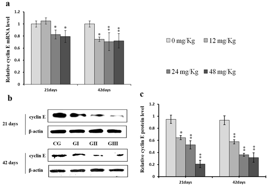 Figure 7: Changes of mRNA and protein expression levels of cyclin E in the liver at 21 and 42 days of experiment. (a) The relative mRNA expression levels of cyclin E. (b) The western blot assay of cyclin E. (c) The relative protein expression levels of cyclin E. CG: Control group; GI: 12mg/kg group; GII: 24mg/kg group; GIII: 48mg/kg group. Data are presented with the means ± standard deviation (n=8), *p<0.05, compared with the control group; **p<0.01, compared with the control group.