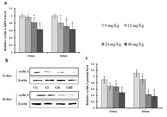 Figure 8: Changes of mRNA and protein expression levels of cyclin A in the liver at 21 and 42 days of experiment. (a) The western blot assay of cyclin A. (b) The relative mRNA expression levels of cyclin A. (c) The relative protein expression levels of cyclin A. CG: Control group; GI: 12mg/kg group; GII: 24mg/kg group; GIII: 48mg/kg group. Data are presented with the means ± standard deviation (n=8), *p<0.05, compared with the control group; **p<0.01, compared with the control group.