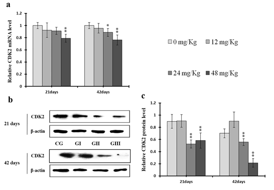 Figure 10: Changes of mRNA and protein expression levels of CDK2 in the liver at 21 and 42 days of experiment. (a) The relative mRNA expression levels of CDK2. (b) The western blot assay of CDK2. (c) The relative protein expression levels of CDK2. CG: Control group; GI: 12mg/kg group; GII: 24mg/kg group; GIII: 48mg/kg group. Data are presented with the means ± standard deviation (n=8), *p<0.05, compared with the control group; **p<0.01, compared with the control group.