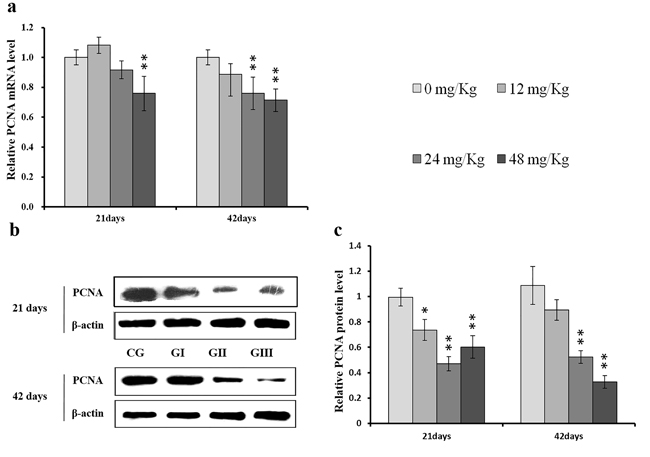Figure 11: Changes of mRNA and protein expression levels of PCNA in the liver at 21 and 42 days of experiment. (a) The relative mRNA expression levels of PCNA. (b) The western blot assay of PCNA. (c) The relative protein expression levels of PCNA. CG: Control group; GI: 12mg/kg group; GII: 24mg/kg group; GIII: 48mg/kg group. Data are presented with the means ± standard deviation (n=8), *p<0.05, compared with the control group; **p<0.01, compared with the control group.