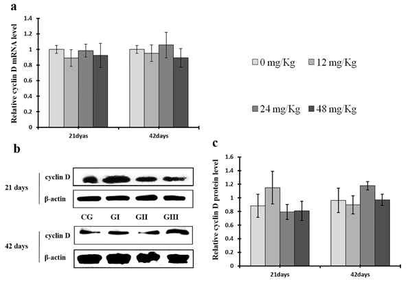 Figure 13: Changes of mRNA and protein expression levels of cyclin D in the liver at 21 and 42 days of experiment. (a) The relative mRNA expression levels of cyclin D. (b) The western blot assay of cyclin D. (c) The relative protein expression levels of cyclin D. CG: Control group; GI: 12mg/kg group; GII: 24mg/kg group; GIII: 48mg/kg group. Data are presented with the means ± standard deviation (n=8), *p<0.05, compared with the control group; **p<0.01, compared with the control group.