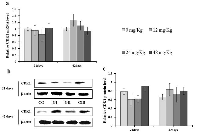 Figure 14: Changes of mRNA and protein expression levels of CDK1 in the liver at 21 and 42 days of experiment. (a) The relative mRNA expression levels of CDK1. (b) The western blot assay of CDK1. (c) The relative protein expression levels of CDK1. CG: Control group; GI: 12mg/kg group; GII: 24mg/kg group; GIII: 48mg/kg group. Data are presented with the means ± standard deviation (n=8), *p<0.05, compared with the control group; **p<0.01, compared with the control group