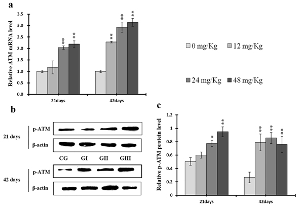 Figure 15: Changes of mRNA level of ATM and protein expression levels of p-ATM in the liver at 21 and 42 days of experiment. (a) The relative mRNA expression levels of ATM. (b) The western blot assay of p-ATM. (c) The relative protein expression levels of p-ATM. CG: Control group; GI: 12mg/kg group; GII: 24mg/kg group; GIII: 48mg/kg group. Data are presented with the means ± standard deviation (n=8), *p<0.05, compared with the control group; **p<0.01, compared with the control group.