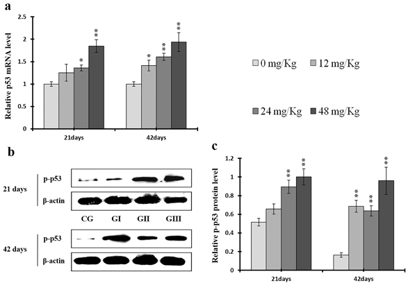 Figure 16: Changes of mRNA level of p53 and protein expression levels of p-p53 in the liver at 21 and 42 days of experiment. (a) The relative mRNA expression levels of p53. (b) The western blot assay of p-p53. (c) The relative protein expression levels of p-p53.CG: Control group; GI: 12mg/kg group; GII: 24mg/kg group; GIII: 48mg/kg group. Data are presented with the means ± standard deviation (n=8), *p<0.05, compared with the control group; **p<0.01, compared with the control group.