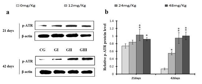 Figure 18: Changes of protein expression levels of p-ATR in the liver at 21 and 42 days of experiment. (a) The western blot assay of p-ATR. (b) The relative protein expression levels of p-ATR. CG: Control group; GI: 12mg/kg group; GII: 24mg/kg group; GIII: 48mg/kg group. Data are presented with the means ± standard deviation (n=8), *p<0.05, compared with the control group; **p<0.01, compared with the control group.
