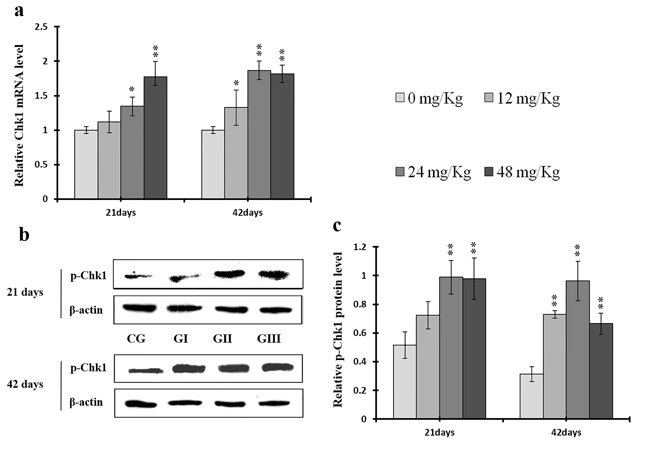 Figure 19: Changes of mRNA level of Chk1 and protein expression levels of p-Chk1 in the liver at 21 and 42 days of experiment. (a) The relative mRNA expression levels of Chk1. (b) The western blot assay of p-Chk1. c The relative protein expression levels of p-Chk1. CG: Control group; GI: 12mg/kg group; GII: 24mg/kg group; GIII: 48mg/kg group. Data are presented with the means ± standard deviation (n=8), *p<0.05, compared with the control group; **p<0.01, compared with the control group.
