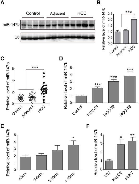 Figure 1: Up-regulation of miR-147b was found in HCC tumor samples and cell lines. (A, B) Northern blot detection of miR-147b in nontumor control, adjacent tissues and HCC tumor tissues, the representative pictures (A) and statistics data (B) were shown. (C) qPCR detection of miR-147b level in different type of tissues. (D-E) qPCR detection of miR-147b expression level in HCC tissues in different disease stage (D) or with different tumor volume (E). (F) qPCR detection of miR-147b level in liver cell lines. snRNA U6 expression used as the loading control. *P<0.05, **P<0.01, ***P<0.001.
