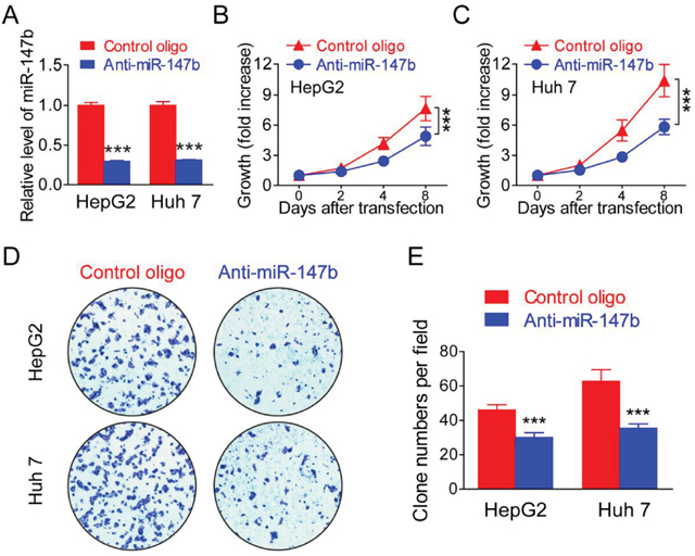 Figure 2: Knockdown of miR-147b inhibitsl proliferation in HCC tumor cells. MiR-147b was knockdown in HepG2 and Huh 7 by anti-sense oligo (Control or anti-miR-147b). (A) mRNA level of miR-147b in HepG2 and Huh 7 after oligo transfection. (B-C) Proliferation of HepG2 (B) and Huh 7 (C) was measured using the MTS assay. (D-E) Formation of colonies in HepG2 and Huh 7 transfected with oligos, the representative pictures (D) and statistics data (E) were shown. ***P<0.001.