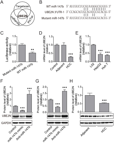 Figure 4: UBE2N was identified as miR-147b target. (A) UBE2N gene was predicted as the potential miR-147b target predicted by several programs. (B) MiR-147b binding elements in the 3’-UTR of UBE2N and the mutated sites. (C) Luciferase reporter analysis of direct binding of miR-147b to the 3’-UTR of UBE2N. (D-E) mRNA expression levels of UBE2N in clinical samples (D) and HCC cell lines (E). (F-G) After transfected with scramble control, miR-147b mimic and anti-miR-147b oligoes, protein levels of UBE2N in HepG2 (F) and Huh 7 (G) cell lines were detected with specific antibody. (H) Protein level of UBE2N in adjacent tissues and HCC tumor tissues were analyzed by western blot. **P<0.01, ***P<0.001.