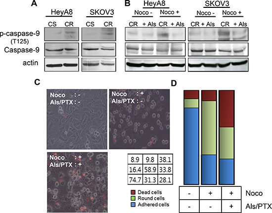 Figure 2: CDK1 mediates paclitaxel-induced chemoresistance through caspase-9. (A) Total caspase-9 and phospho-caspase-9 levels were analyzed by western blot. Actin was used as a loading control. CS, chemosenstive; CR, chemoresistant. (B) HeyA8-MDR and SKOV3-TR cells were treated with nocodazole to arrest cells in their mitosis. Noco, nocodazole; Als, alsterpaullone; PTX, paclitaxel. (C) Cell death was compared between three experimental groups: alsterpaullone-pretreated cells (upper left), alsterpaullonepretreated cells with added nocodazole (upper right), and alsterpaullone-pretreated cells with added paclitaxel and nocodazole (lower left). Administration of paclitaxel was followed by nocodazole treatment. (D) Populations of adherent (blue) and floating (green) cells are shown. Dead cells were stained with red dye.