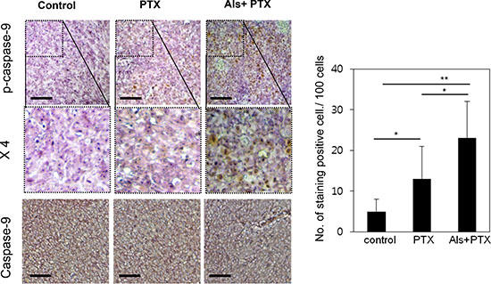 We injected HeyA8-MDR cells in the flank region of mice. Three weeks before administration of paclitaxel, either 0.9% saline or alsterpaullone (5 mg/kg) was intraperitoneally injected every other day. At week 7, the tumors were isolated and subjected to immunohistochemical analysis. Phospho-caspase-9 level was lower in tumors treated with alsterpaullone as compared with the untreated tumors (Figure 5).