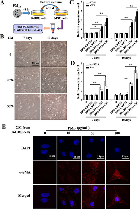 Figure 2: Conditioned medium from PM2.5-treated 16HBE cells induces the differentiation of BMSCs. (A) Experimental protocol for PM2.5-exposed cells. 16HBE cells were treated with PM2.5 (10–100 μg/mL) for 48 hours, cell culture supernatants were removed, centrifuged and diluted 1:4 or 1:2 with DMEM/HBMSC-GM medium (without serum). BMSCs were exposed to CM from 16HBE cells for 7 or 10 days. (B) The morphology of BMSCs. mRNA levels of (C) CD31, vWF, (D) a-SMA and Fap were measured. (E) The localization of a-SMA in BMSCs upon 50% CM exposure for 7 days were determined (60× magnification); scale bars = 15 μm. The values were showed as means ± SD of triplicate determinations. *p < 0.05, **p < 0.01, compared with control.
