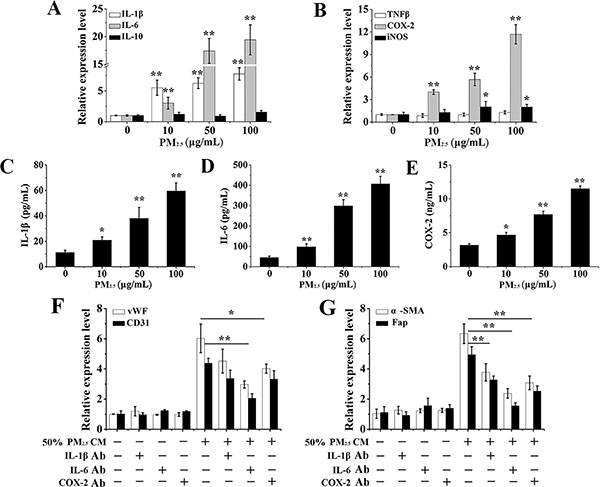Figure 3: The effects of PM2.5-induced inflammatory cytokines from 16HBE cells on BMSCs differentiation. mRNA levels of (A) IL-1β, IL-6, IL-10, (B) TNFβ, iNOS and COX-2 in 16HBE cells. (C–E) IL-1β, IL-6 and COX-2 secretions in cell culture supernatants of 16HBE cells. Then, conditioned medium from 100 μg/mL PM2.5-treated 16HBE cells was incubated with neutralization antibody against IL-1β (5 μg/mL), IL-6 (10 μg/mL), or COX-2 (2 μg/mL) at 37°C for 30 minutes before adding to the BMSCs. Gene expressions of (F) CD31, vWF, (G) a-SMA and Fap after 10 days of exposure were evaluated. Data represented were mean ± SD of three identical experiments. *p < 0.05, **p < 0.01, compared with control.