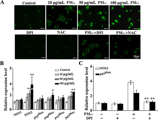 Figure 4: PM2.5 elevates the ROS production from NOX in 16HBE cells. (A) After pre-treated with fresh media containing DPI (3 μΜ) or NAC (1 mM) for 6 hours and then treated with 100 μg/mL PM2.5 in the presence of inhibitors for 48 hours, representative microphotographs showing ROS content in 16HBE cells. Images were captured by a fluorescence microscope (20× magnification), scale bars = 50 μm. (B) qRT-PCR assay was carried out to measure the expressions of NOX subunits. (C) After pre-treated with fresh media containing DPI (3 μΜ) for 6 hours and then treated with 100 μg/mL PM2.5 suspensions in the presence of inhibitors for 48 hours, the expressions of p22phox and p67phox were measured. Data represented were mean ± SD of three identical experiments. Statistically significant different from control: *p < 0.05, **p < 0.01.