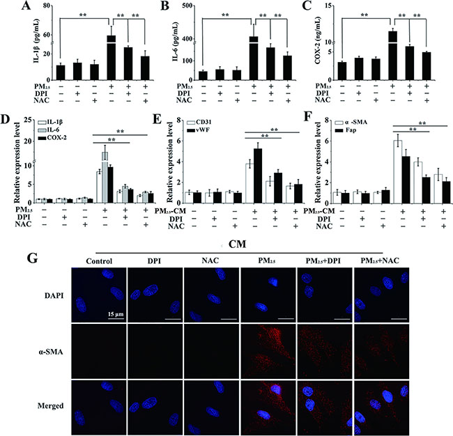 To further investigate whether CM triggered differentiation of BMSCs was mediated by epithelial derived inflammation factors, CM with or without DPI or NAC pre-treatment was added. Firstly, the secretions and expressions of inflammatory cytokines were studied by ELISA and qRT-PCR assay. Notably, a decrease in the elevated release of inflammatory mediators (IL-1β, IL-6 and COX-2) in PM2.5-treated cell culture supernatants was observed upon DPI or NAC supplement (Figure 5A–5C). Consistently, IL-1β, IL-6 and COX-2 gene expressions were also significantly reduced by the addition of DPI or NAC (Figure 5D). To further investigate whether CM triggered differentiation of BMSCs was mediated by epithelial derived inflammation factors, CM with or without DPI or NAC pre-treatment was added. Interestingly, a significant decrease in mRNA levels of CD31, vWF, a-SMA and Fap was observed when CM from 16HBE cells pre-treated with DPI or NAC was used (Figure 5E and 5F). This consistent effect was confirmed by the prominently repressed of a-SMA nuclear translocation in BMSCs in response to CM with DPI or NAC pre-treatment (Figure 5G). It therefore concludes that the differentiation of BMSCs into CAFs and ELCs is dependent on epithelial cells-derived inflammatory cytokines mediated by PM2.5-induced ROS from NOX.