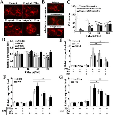 Figure 6: The differentiation of BMSCs provoked by inflammatory cytokines is mediated by PM2.5-induced ROS from mitochondria. (A) MitoTracker Red was carried out to assess the PM2.5-induced alteration in mitochondrial morphology. (B) Different types of typical mitochondrial morphologies. (C) Quantitative analysis of alteration of mitochondrial morphology in PM2.5-treated cells. (D) The complexes of mitochondrial respiratory chain, including NDUFS2, SDHD, UQCRI1 and COX4I1, were investigated by qRT-PCR. After 16HBE cells were treated with PM2.5 for 48 hours with or without the pre-treatment of 5 μM Rot (inhibitor of mitochondrial complex I) or 2 μM AA (inhibitor of mitochondrial complex III) for 6 hours, (E) qRT-PCR was performed to investigate expressions of inflammatory cytokines in 16HBE cells. The expressions of (F) CD31, vWF, (G) a-SMA and Fap in BMSCs were observed when secretions from 16HBE cells pre-treated with Rot or AA. Data represented were mean ± SD of at least three identical experiments. *p < 0.05, **p < 0.01, compared to control.