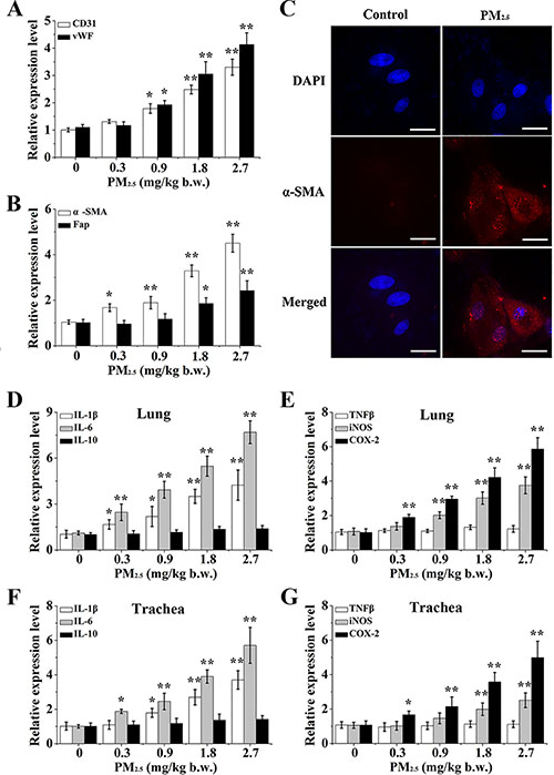 Figure 7: The differentiation of BMSC and inflammatory response caused by PM2.5 in vivo. Gene expressions of (A) CD31, vWF, (B) a-SMA and Fap were observed in BMSCs. (C) The localization of a-SMA in BMSCs of 2.7 mg/kg b.w. PM2.5 exposed rats (60× magnification). Inflammatory cytokines, including (D, F) IL-1β, IL-6, IL-10, (E, G) TNFβ, iNOS and COX-2 were determined in lung tissues or trachea tissues. Values shown were given as the mean ± SD of 6 animals in each group. *p < 0.05, **p < 0.01, compared with control mice.